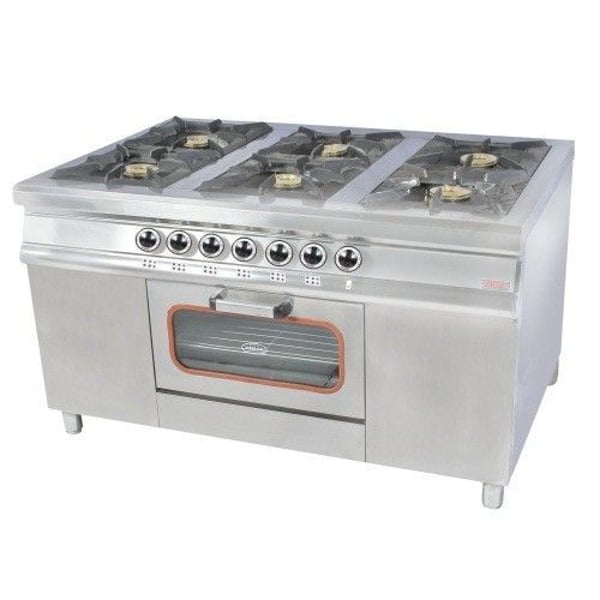 Плита 6і конфоркова настільна з духовкою і газовим контролером. Корпус плити та основні робочі елементи виготовлені з харчової нержавіючої сталі та чавуну.