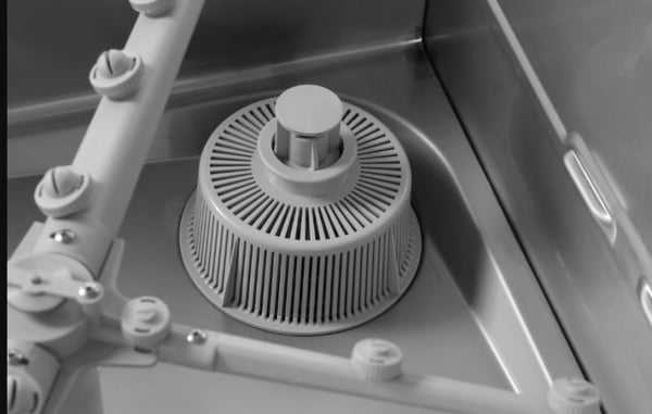 Потім готовий миючий розчин, спеціальним насосом під високим тиском, подається в рукави, що миють, які розташовані зверху і знизу мийної камери. У миючому рукаві розташовані форсунки, через які під кутом подається вода з миючим. Рукави крутяться, створюючи кругообіг води - рівномірно зрізаючи бруд зі стінок посуду.