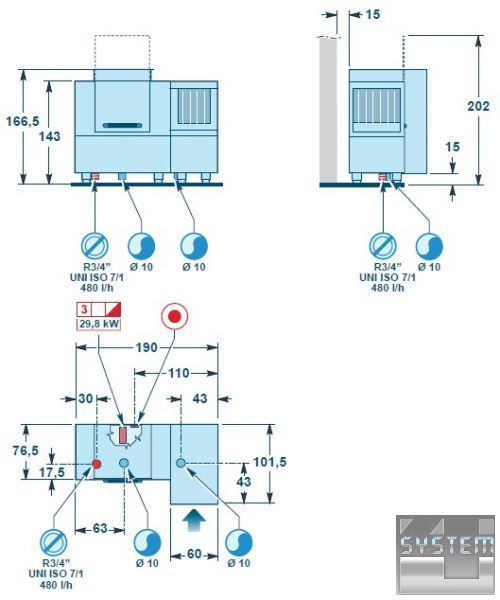 Устройство использует корзины 50 х 50 см. Максимальная рабочая высота моечного туннеля: 45 см. Лучшие результаты получены для воды, имеющей жесткость 8-12 ° F.
