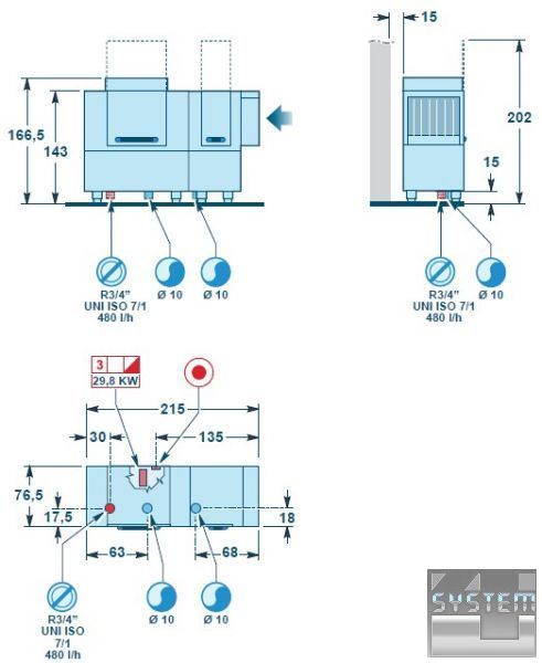 Устройство использует корзины 50 х 50 см. Максимальная рабочая высота моечного туннеля: 45 см. Лучшие результаты получены для воды, имеющей жесткость 8-12 ° F.