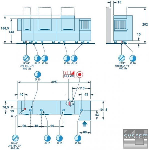 Устройство использует корзины 50 х 50 см. Максимальная рабочая высота моечного туннеля: 45 см. Лучшие результаты получены для воды, имеющей жесткость 8-12 ° F.
