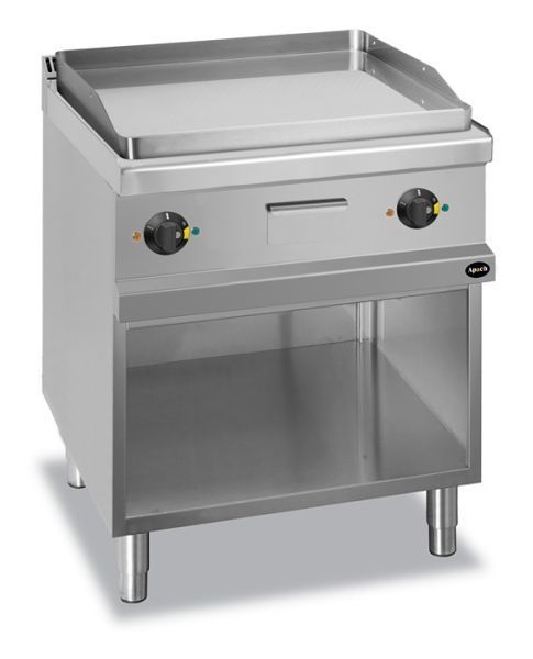 Поверхня гладка 650х500мм завтовшки 150 мм із закругленими кутами. Поверхня для смаження та збірки для стікання жиру виконані з нержавіючої сталі AiSi 304. Каркас жарочної поверхні виконаний з нержавіючої сталі AiSi 304, стійкої до зовнішніх хімічних впливів. Габарити - 700х700х900 мм.