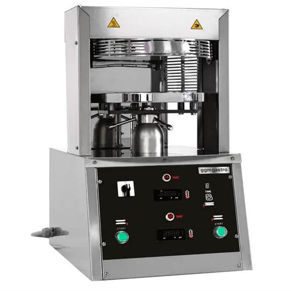 Прес для піци дозволяє формувати круглу основу із тіста для піци діаметром 45 см без кромки. Дві робочі сталеві поверхні, що нагріваються, виконані з нержавіючої сталі. Прес дає можливість змінювати товщину шару тіста для задоволення різних вимог.