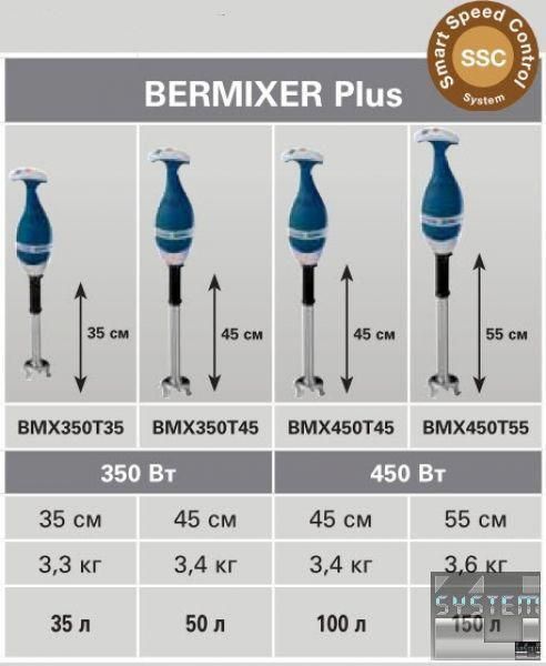 • Занурювальний міксер BERMIXER працює з насадками: трубка-блендер з нерж. сталі для приготування кремів, супів, соусів та пюре; віночок для збивання вершків, яєчних білків або приготування майонезу