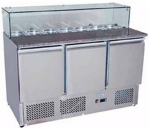 Холодильний стіл, де зверху розташована структура для гастроємностей - це саладетта. У цих ємностях зберігаються або окремі інгредієнти для салатів, або холодні закуски або готові страви не змішуючи їх запахи.