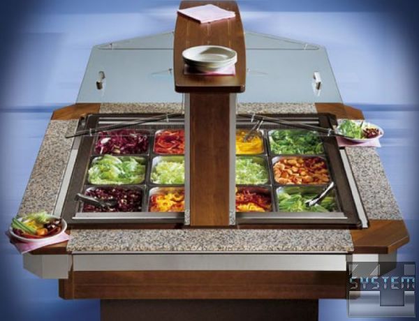Салат-бар – это охлаждаемая витрина для демонстрации и кратковременного хранения охлажденных блюд в торговом зале ресторана или магазина. Салат-бар поддерживает температурный режим -2...+10°С и позволяет разместить несколько гастроемкостей. Салат-бар прекрасно подойдет для организации обслуживания мероприятий по системе «шведский стол», предоставляя посетителям самостоятельно выбрать для себя блюда. В магазинах такое оборудование используется в отделах самообслуживания и позволяет покупателю самостоятельно выбрать нужное количество блюд или продуктов.