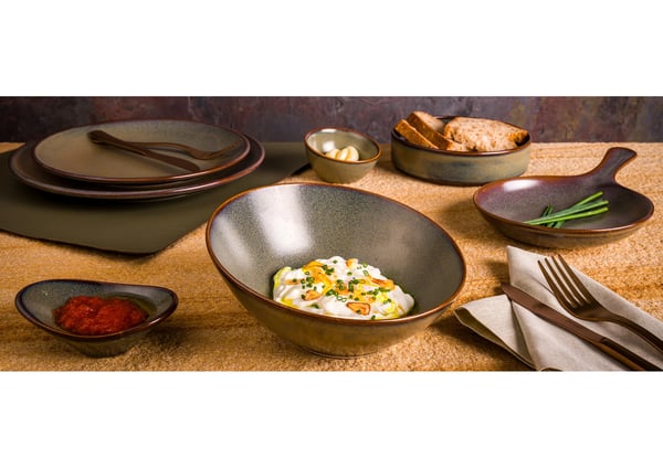 Колекція Bonna Gloire – це колекція професійного порцелянового посуду, розписана вручну та доступна в оригінальному дизайні, який неодмінно привертатиме увагу при подачі. Колекція Bonna Gloire представлена в темній гамі з нотками морського, пісочного, шоколадного та синього кольорів, з напиленням, коричневим кантом, блискучою матовою поверхнею.