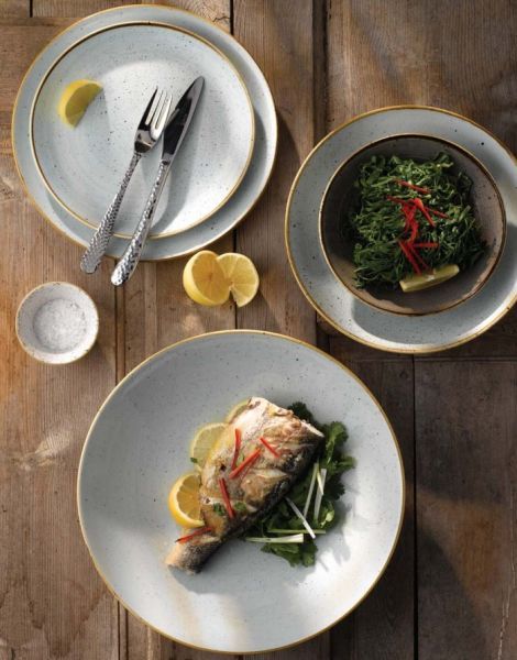 Глибока тарілка круглої форми Churchill із серії White Speckle. Страва зроблена з порцеляни із застосуванням кольорових глазурів.