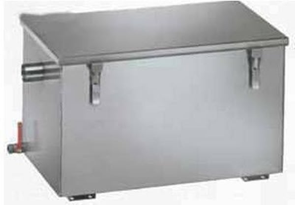 Об'єм шламу становить 52 літрів . Місткість для жиру 132 літрів . Кришка з відкидними замками та приєднувальними штуцерами DN50 . Включаючи штуцери з кулястим краном для спустошення корпусу.