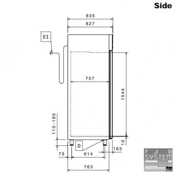 Холодильна шафа ECOSTORE Premium 727249, однодверна, об'ємом 670л., ізоляція товщиною 75мм., температурний режим роботи +2…+10°С, прихований випарник, великий цифровий дисплей, система Frost Watch Control (автоматичне керування відтайкою), цикл тур- теплих продуктів), LED підсвічування камери, двері зі скляною вставкою із замком та оптичним датчиком, клімат клас +32°С, в комплекті з 4 полицями GN 2/1 та напрямними, низький рівень енергоспоживання, холодоагент R134a, фронтальний вологозахист IPX5, виконання . сталь AISI 304. Професійний холодильник має прямокутну конструкцію з габаритними розмірами: 710мм (довжина), 837мм (глибина), 2050мм (висота).