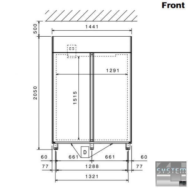 Холодильна шафа ECOSTORE 727295, дводверна, об'ємом 1430л., ізоляція товщиною 75мм., температурний режим роботи 0…+6°С, прихований випарник, цифровий дисплей, автоматична відтайка, двері із замком та оптичним датчиком, клімат клас +4 комплект з 6 полицями GN 2/1 і напрямними, низький рівень енергоспоживання (Class 6), виконання нерж. сталь Професійний холодильник має прямокутну конструкцію з габаритними розмірами: 1441мм (довжина), 837мм (глибина), 2050мм (висота).