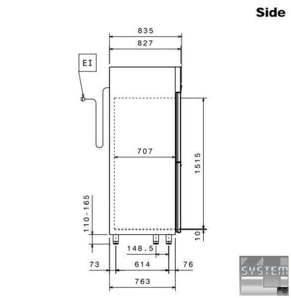 Холодильна шафа ECOSTORE 727284, чотиридверна 4½, об'ємом 1430л., температурний режим роботи -2...+10°С, ізоляція товщиною 75мм., прихований випарник, цифровий дисплей, автоматична відтайка, двері із замком та оптичним датчиком °С, в комплекті з 6 полицями GN 2/1 та направляючими, низький рівень енергоспоживання (Class 6), виконання нерж. сталь AISI 304. Професійний холодильник має прямокутну конструкцію з габаритними розмірами: 1441мм (довжина), 837мм (глибина), 2050мм (висота).