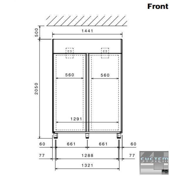 Холодильно/морозильна шафа ECOSTORE Premium 727269 дводверна, двокамерна, об'ємом 1430л., ізоляція товщиною 75мм., температурний режим роботи -2...+10/-22…-15°С, прихований випарник, великий цифровий дисплей, система Frost (автоматичне управління відтайкою), цикл турбо-охолодження (теплих продуктів), LED підсвічування камери, двері із замком та оптичним датчиком, клімат клас +43°С, в комплекті з 8 полицями GN 2/1 та напрямними, низький рівень енергоспоживання, виконання нерж. сталь AISI 304 . Професійний холодильник має габаритні розміри: 1441мм (довжина), 837мм (глибина), 2050мм (висота).