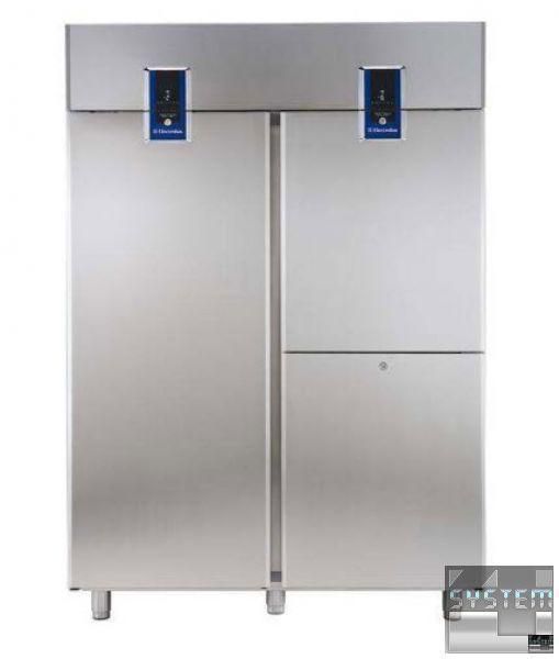 Холодильно/морозильна шафа ECOSTORE Premium 727271 тридверна, двокамерна, об'ємом 1430л., ізоляція товщиною 75мм., температурний режим роботи -2...+10/-22…-15°С, прихований випарник, великий цифровий дисплей, система Frost (автоматичне управління відтайкою), цикл турбо-охолодження (теплих продуктів), LED підсвічування камери, двері із замком та оптичним датчиком, клімат клас +43°С, в комплекті з 8 полицями GN 2/1 та напрямними, низький рівень енергоспоживання, виконання нерж. сталь AISI 304. Професійний холодильник має габаритні розміри: 1441мм (довжина), 837мм (глибина), 2050мм (висота).