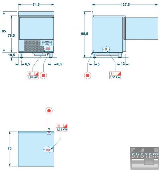 Є в наявності базова модель апаратів швидкого охолодження/шокової заморозки, мод . KDMS51A з робочою стільницею з нержавіючої сталі AISI 304 з пристінком, висотою 50 мм і товщиною 15/10 мм.