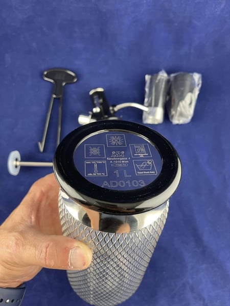 Пляшка з пластика (ПЕТФ) покрита сіткою з полірованої високоякісної сталі, головка пристрої з важелем тиску.