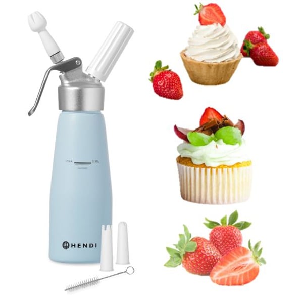 Сифон для збивання вершків HENDI 975862-1 відноситься до кондитерського інвентарю для ресторанів, кафе, барів та інших закладів громадського харчування. Дозволяє легко і швидко приготувати збиті вершки, креми, муси, також чудово послужить прикрасою для капучино, кави, шийок, морозива та кондитерських виробів.