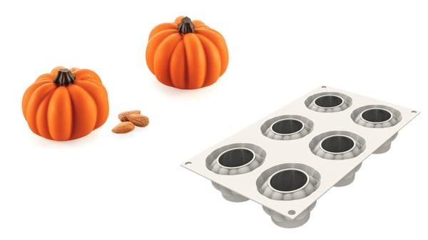 Універсальна силіконова форма DELICA від Silikomart дозволяє точно відтворити форму фруктів у 3D, створивши однопорційну форму на тему Хеллоуїна. Форму використовують як форму для десертів, форму для випічки та форму для мусових десертів.