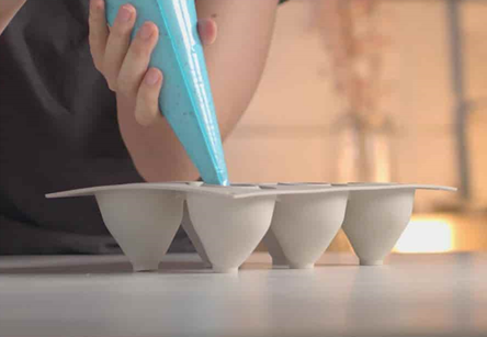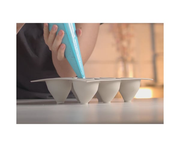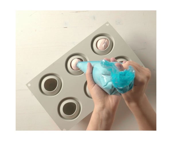 — Видаліть надлишки тіста, почистивши поверхню силіконової форми, щоб запобігти розливанню. —Випікайте в попередньо розігрітій до 170°C духовці, краще в духовці з вентилятором (7 хвилин).