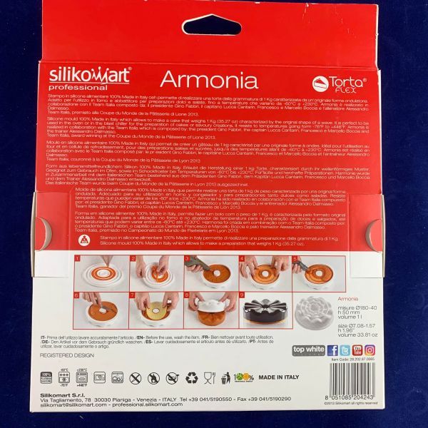 Тільки форми Silikomart піддаються термічній обробці, яка триває в середньому 6-7 годин, гарантуючи повне усунення будь-яких токсичних речовин. Належить до професійного кондитерського інвентарю для ресторанів.