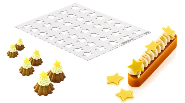 Текстурований силіконовий килимок-трафарет CHABLON STAR від Silikomart призначений для створення заготовок унікальних прикрас з айсингу, шоколаду та мастики як деталь-завершення композиції десерту. Він ідеально підходить для прикрашання тортів, капкейків, морозива, мусу, хліба тощо, надаючи кондитерам можливість реалізувати найсміливіші творчі задуми. Налийте шоколад або ізомальт у порожнини форми, щоб у найкоротші терміни створити прикраси для ваших десертів.