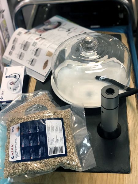 Як правило, на фарфорову або сланцеву страву поміщається м'ясний чи рибний продукт, накривається скляним ковпаком та підключається коптильний пістолет.