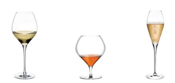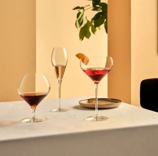 Елегантно звужена ніжка з місткою грушоподібною чашею з ледь помітними заглибленнями внизу, що надають склянці витонченої грайливості.