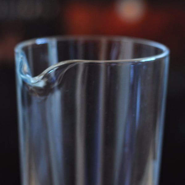 Особливість цієї барної склянки в тому, що вона оснащена носиком. З цього зручно переливати рідину в інші ємності.