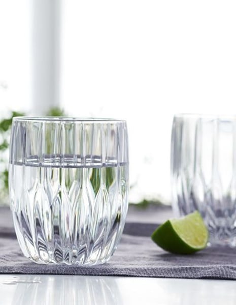 Низька склянка виконана з кришталевого скла, яке має високий коефіцієнт заломлення і відноситься до категорії професійного посуду, може використовуватися дуже інтенсивно кожен день, його можна мити в посудомийці.