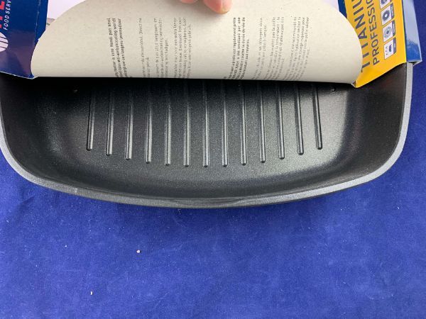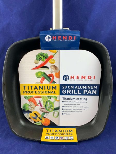 Професійна сковорода-гриль з рифленим дном виконана з твердого алюмінієвого лиття з антипригарним титановим покриттям. Ручка сковороди виготовлена із високоякісної нержавіючої сталі, яка не нагрівається, тому неможливо отримати опік.