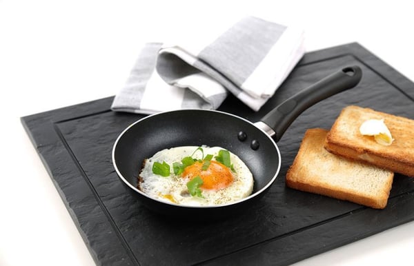 Професійна сковорода виготовлена з алюмінію з антипригарним покриттям, ручка із пластику. Ідеально підходить для сервірування яєчні, креветок та інших невеликих гарячих страв.