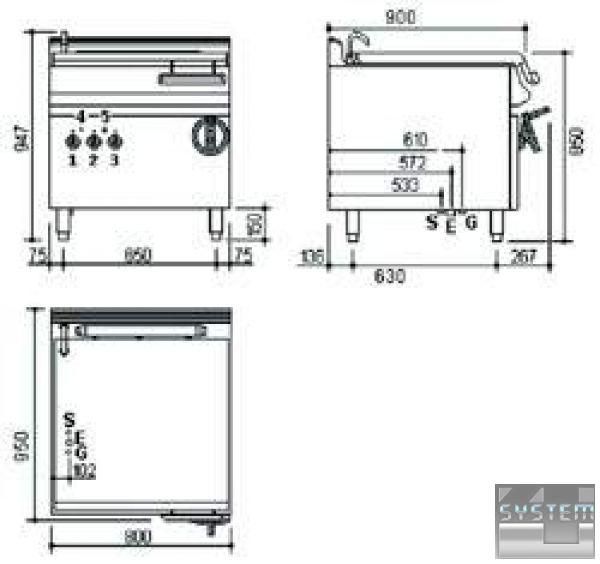 Основна частина зроблена із сатинованого хромонікелевого листа 18/8 н/с, каркас товщиною 2 мм. Покриття із подвійними стінками спеціально розроблене для зміцнення. Рівномірне поширення тепла та збереження тепла в період тривалого часу забезпечується за допомогою привареного другого металевого дна до сковороди. Завдяки спеціальному перекидному механізму сковорода легко перекидається, і кут перекидання становить 85°. Втулка для наповнення чи чищення сковороди. Температура регулюється в межах 50-300 ° C за допомогою багаторівневого термостату. Може використовуватись СНД або ПГ (природний газ), і перетворення відбувається без будь-якої модифікації. Оснащений газовим вентилем, розточувальним факелом та термореле, у разі відключення газу газовий вентиль припиняє подачу газу. Газовий пальник розроблений для використання газу різного типу. Кнопка автоматичного запалювання. Обмежувальний термостат автоматично припиняє подачу енергії у разі несправності. Механізм перемикання припиняє подачу енергії під час перекидання сковороди.