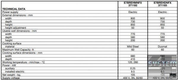 Сковорода гаряча Electrolux e7brehdnfx має потужність 9,5кВт. Тигельна сковорода з ванною об'ємом 60л, що перекидається, ємність для смаження - Duomat 10мм, інфрачервоні нагрівальні елементи, регулювання температури 120...280°С, механічна система підйому, захисний термостат, товщина металу робочої поверхні апарату 1,5 мм. Сковорода має габаритні розміри: 800мм (довжина), 730мм (глибина), 850мм (висота) та важить 105кг. Пристрій живиться від трифазної мережі з напругою 400В та частотою 50 Гц. Оснащена індикатором роботи та контролю напруги. Робоча поверхня із нержавіючої харчової сталі AISI 304 з поліруванням Scotch Brite .
