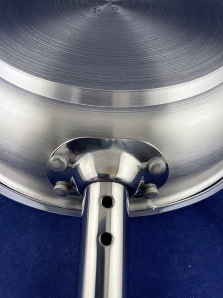 У сковороди довга порожня ручка із нержавіючої сталі прикріплена заклепками. Ручка не нагрівається, тому неможливо одержати опік. Сковорода стійка до корозії та впливу кислот.