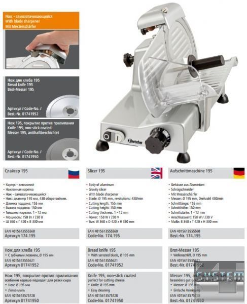 Слайсеры используются для быстрой и эффективной нарезки разных гастрономических товаров (колбасы, сыра, хлебобулочных изделий), а также мяса, рыбы и фруктов. Слайсер или ломтерезка, электронож, гастрономическая машина (slicer)– это устройство для нарезки гастрономических товаров (мясных и колбасных изделий, овощей, сыра, хлебобулочных товаров) с определенной толщиной (от 1 до 16 мм). Слайсеры обеспечивают быструю и точную нарезку продуктов. На нарезку одного батона сырокопченой колбасы слайсеру потребуется всего 2, 5 – 3, 5 минуты, в то время как повар тратит на это в два раза больше времени. Такая операция не только не потребует каких-либо серьезных физических затрат, но и будет выполнена просто идеально. Профессиональный слайсер режет продукты очень ровно, кусочек к кусочку. Это дает возможность точно рассчитать в граммах выход любого продукта, задавая каждому из них свою толщину нарезки. Все слайсеры легко настраиваются на резку разных продуктов со своей толщиной. Принцип работы слайсера очень прост. Продукт, освобожденный от упаковки, кладется на рабочую поверхность и при помощи каретки передвигается навстречу дисковому ножу, который отрезает от продукта кусок заданной толщины. После этого каретку возвращают на исходную позицию и затем снова повторяют ту же последовательность действий до тех пор, пока продукт не будет нарезан в необходимом количестве.