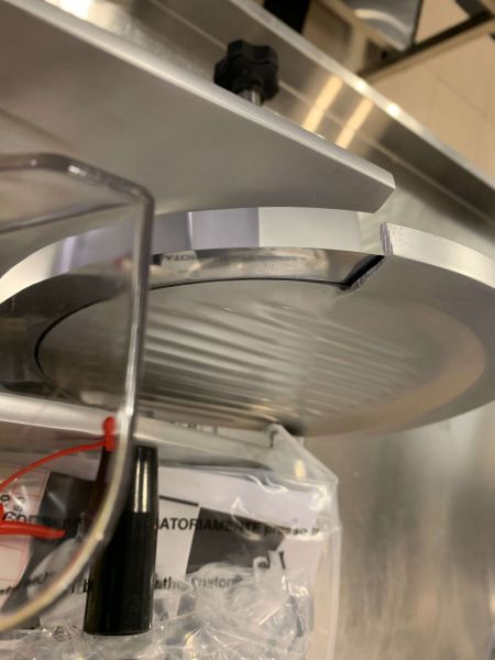 Ломтерізка оснащена прозорим захисним екраном з акрилу, який захищає руки працівника від ріжучого диска. Можливий демонтаж акрилового кожуха – це сприяє зручності при очищенні пристрою після робочого процесу.