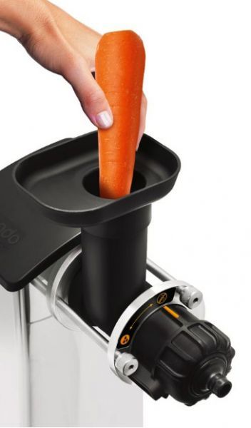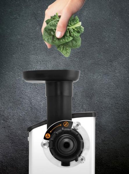 Ергономічна кришка барабана дозволяє блокувати будь-який витік соку і запобігає капанню. Завдяки лотку, що подає (Ø60 мм) і притискній камері, фрукти та овочі можуть бути вставлені цілими або великими шматками, що скорочує час приготування.