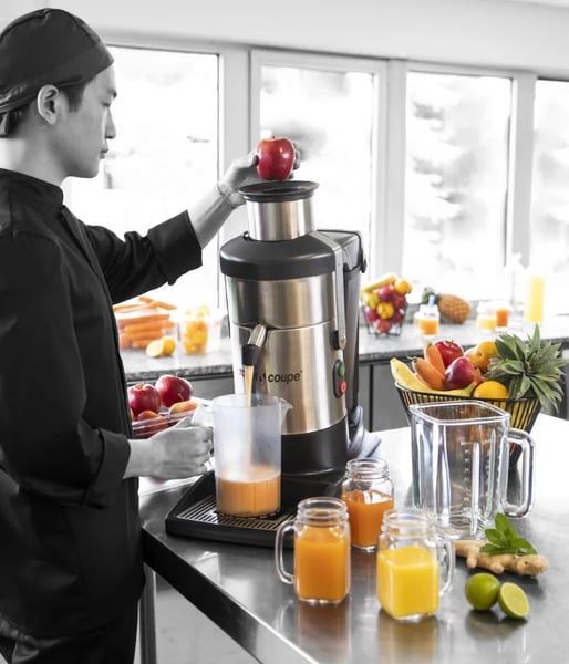 Соковитискач ROBOT COUPE J100 ідеально підходить для приготування соків з винограду, ананасу, апельсинів, яблук, томатів, буряків, моркви, селери, огірків і т. д. Ананаси або цитрусові повинні бути спочатку очищені. Завантаження фруктів та овочів без використання штовхача завдяки автоматичній ексклюзивній запатентованій системі завантаження. Для легшого догляду, металеве сито встановлюється без використання додаткових інструментів. Швидкий, ефективний, надійний та рентабельний соковитискач - це ідеальне рішення для джус-барів та супермаркетів.