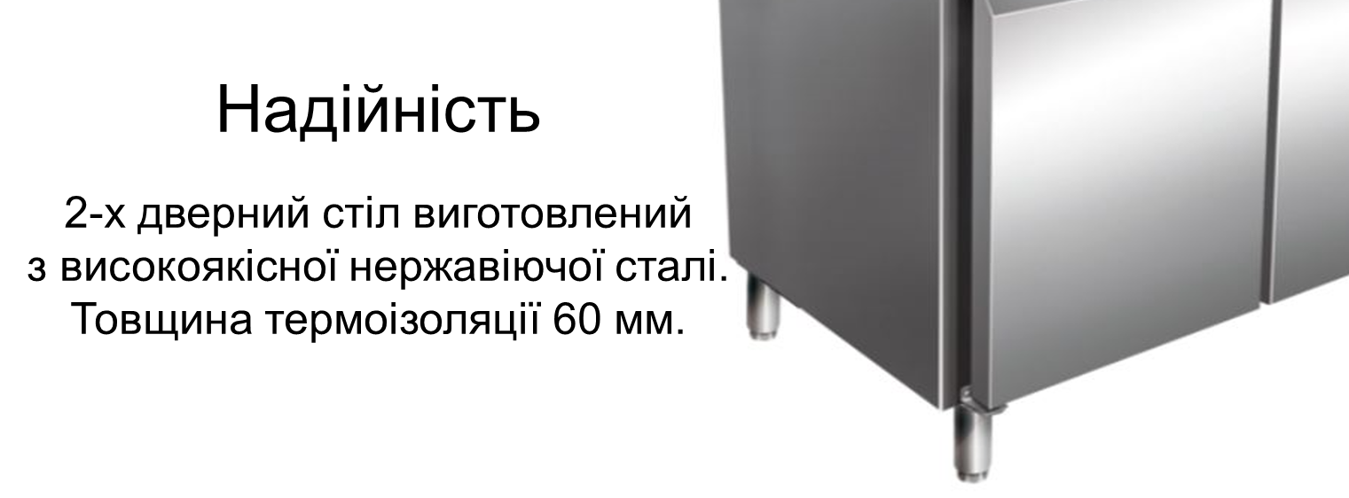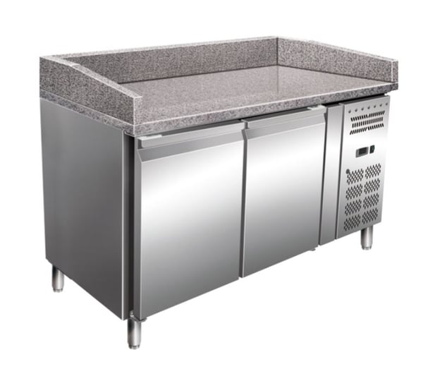 Стіл для піци 2-х дверний з гранітною поверхнею з бортом, призначений для зберігання готової начинки та для зберігання харчових продуктів, які використовують для приготування піци. Також стіл придатний як для тимчасового зберігання і обробки продуктів харчування, десертів, коктейлів, так і як окремий елемент холодильного обладнання. Це дуже зручне і необхідне професійне обладнання на кухні будь-якого ресторану, кафе, бару і великих підприємствах. Внутрішнє та зовнішнє оздоблення - нержавіюча сталь. Тип охолодження: вентильований. Безперебійна робота обладнання гарантується виробником при температурі повітря не більше +32°C / 50%HR (кліматичний клас 4). Холодоагент R600a.