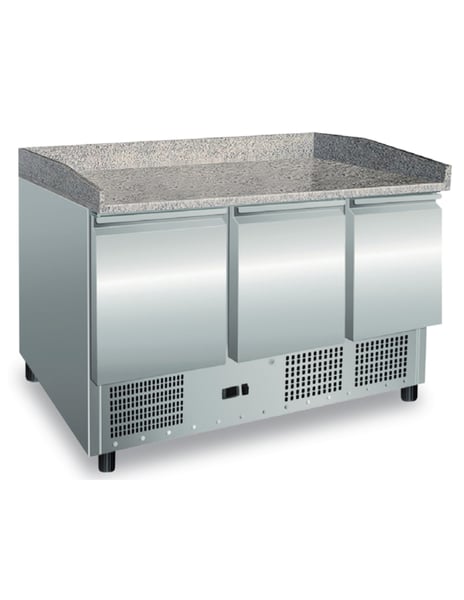 Стіл холодильний для піци 3-х дверний з гранітною поверхнею, призначений для зберігання готової начинки та для зберігання харчових продуктів, які використовують для приготування піци. Також стіл придатний як для тимчасового зберігання і обробки продуктів харчування, десертів, коктейлів, так і як окремий елемент холодильного обладнання. Це дуже зручне і необхідне професійне обладнання на кухні будь-якого ресторану, кафе, бару і великих підприємствах. Внутрішній об'єм: 368 л, 1 решітчаста полиця GN 1/1 із пластиковим покриттям у кожному відділенні. Використовується разом з холодильною вітриною А-VRX1400 на 6 гастроємностей GN1/4 (вітрина та гастроємності - опція). Внутрішнє та зовнішнє оздоблення - нержавіюча сталь. Холодоагент R290. Безперебійна робота обладнання гарантується виробником при температурі повітря не більше +32°C / 50%HR (кліматичний клас 4).