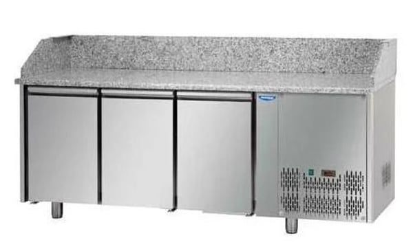 Усередині столу зберігаються тестові заготовки і проходять процес ферментації, на гранітній стільниці готують красти і укладають начинку, а в вітрині, що охолоджується, зберігається сама начинка. Це дуже зручне та необхідне професійне обладнання на кухні піцерії, ресторану, кафе, бару та великих підприємствах.