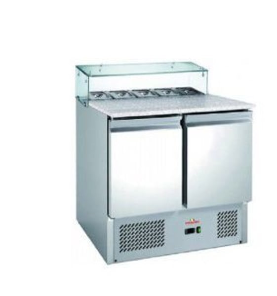 Дводверний стіл виготовлений з нержавіючої сталі, стільниця виконана з граніту, тому гранітна поверхня полегшує роботу з тестом. Кам'яна поверхня є більш прохолодною, менш слизькою і легко миється. Отвори всередині столу призначені під гастроємність 5хGN1/6. Примусове охолодження, вбудований агрегат, цифровий електронний термостат, підігрів по контуру дверей для усунення конденсату. Автоматична відтайка і з автоматичним контролем температури розморожування також автоматичне випаровування конденсату. Двері, що самозакриваються, з поворотним механізмом. Ізоляція 50мм. Температура довкілля +33°C. Ніжки з нержавіючої сталі, що регулюються по висоті.