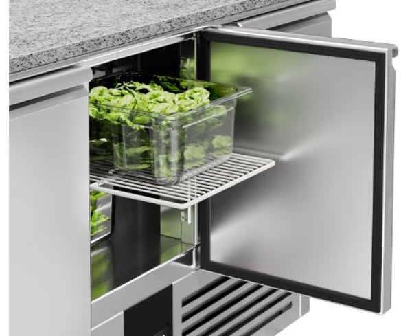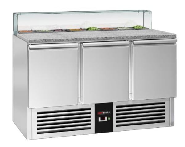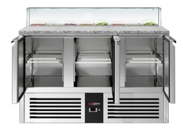 Стіл холодильний 3-х дверний GGM SAG147OG#GSG147E призначений для зручності приготування найпопулярнішої страви у меню багатьох закладів – піци: підходить для розкочування тіста, обробки інгредієнтів для приготування страв та довготривалого зберігання продуктів і напоїв на підприємствах громадського харчування та торгівлі. Перевага даного холодильного столу полягає у поєднанні робочої поверхні з холодильною камерою, що забезпечує комфортні умови для роботи кухаря та дозволяє використовувати робочий простір з максимальною користю – інгредієнти можна легко діставати і обробляти прямо на столі. Крім того, холодильний стіл може використовуватися для розміщення різного допоміжного обладнання. Виконання PREMIUM забезпечує високу продуктивність із низьким енергоспоживанням (екологічність).