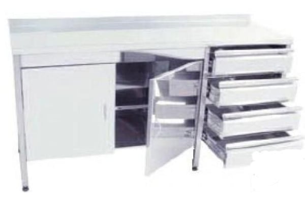 Столи-тумби призначені для зберігання посуду, інвентарю та упакованих харчових продуктів. Стільниця служить робочою поверхнею. Завдяки наявності закритого обсягу, предмети, що виставляються, захищені від жирового нальоту, пари і пилу. Столи-тумби повністю виготовлені з нержавіючої сталі, що забезпечують акуратний зовнішній вигляд та дозволяє застосовувати їх у гарячих цехах, мийних відділеннях з великою вологістю. Столи-тумби забезпечені регульованими по висоті гвинт-опорами. Пристінний борт заввишки 50 мм. Висувні ящики для зручності сан.обробки можуть зніматися.
