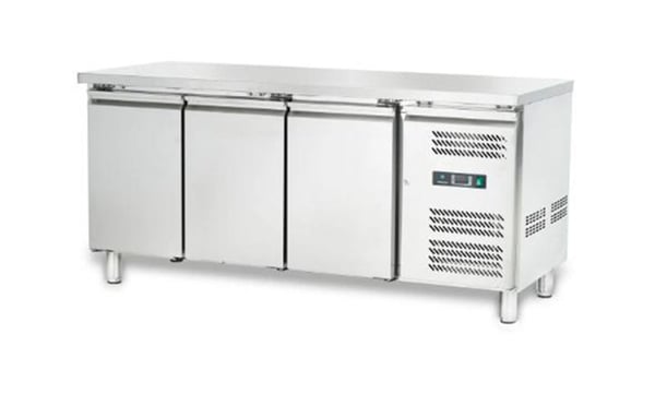 Стіл холодильний з трьома орними дверима з поворотним механізмом, також підігрів по контуру дверей перешкоджає утворення конденсату. Вбудований агрегат, який легко витягується для обслуговування обладнання.