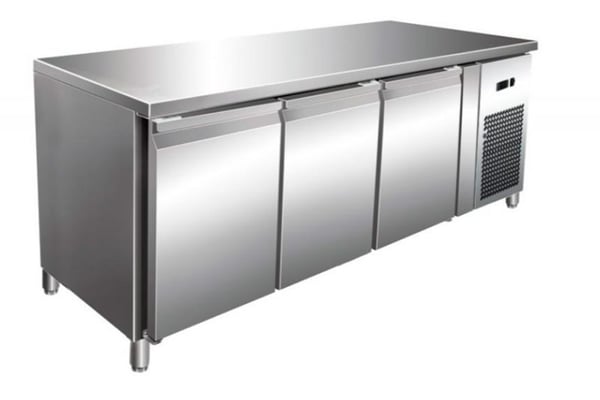 Стіл холодильний з трьома орними дверима з поворотним механізмом, також підігрів по контуру дверей перешкоджає утворення конденсату. Вбудований агрегат, який легко витягується для обслуговування обладнання.
