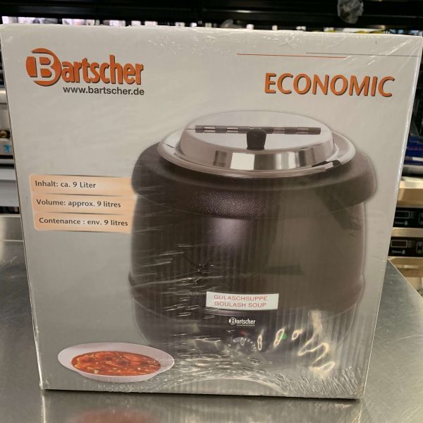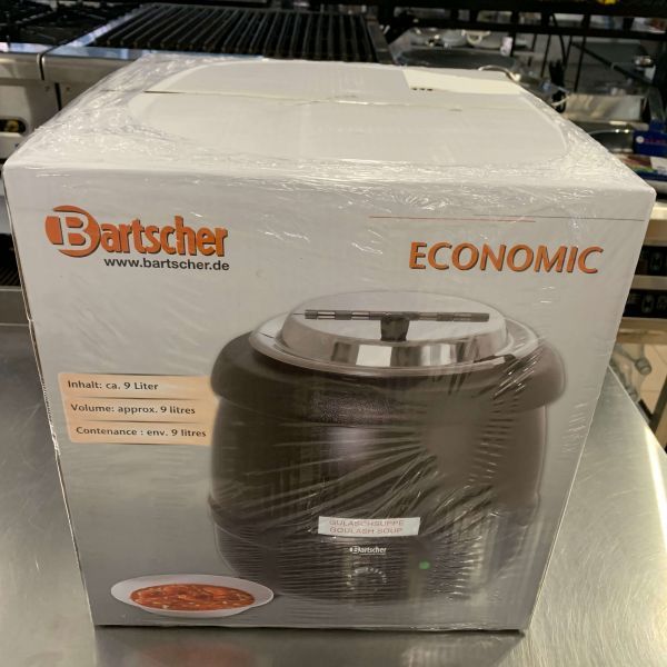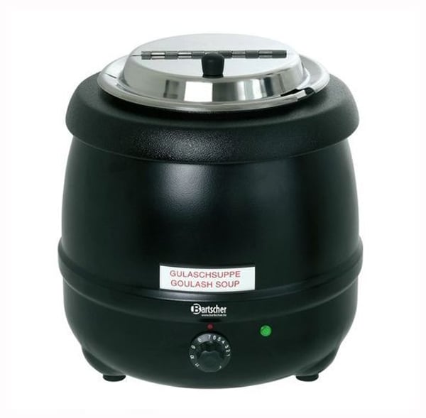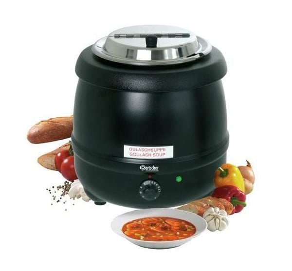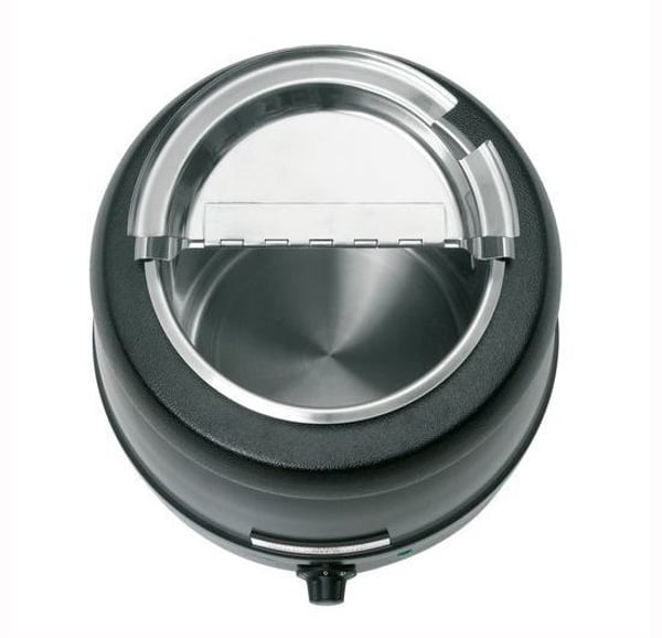Електрична супниця з відкидною кришкою з нержавіючої сталі зручна у використанні. Є виріз для ковша та теплоізольована ручка.