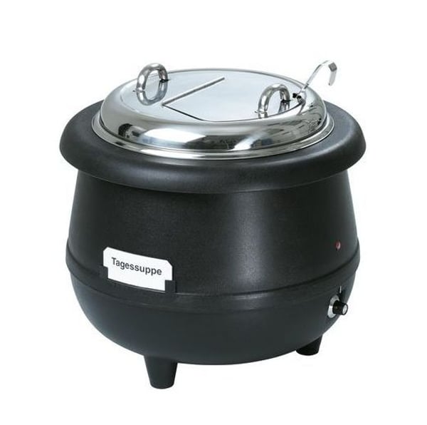 Корпус електричної супниці з відкидною кришкою виконаний з чорного пластику, а внутрішня каструля з хромонікелевої сталі, що виймається, яка зручна у використанні, є виріз для ковша і теплоізольована ручка.