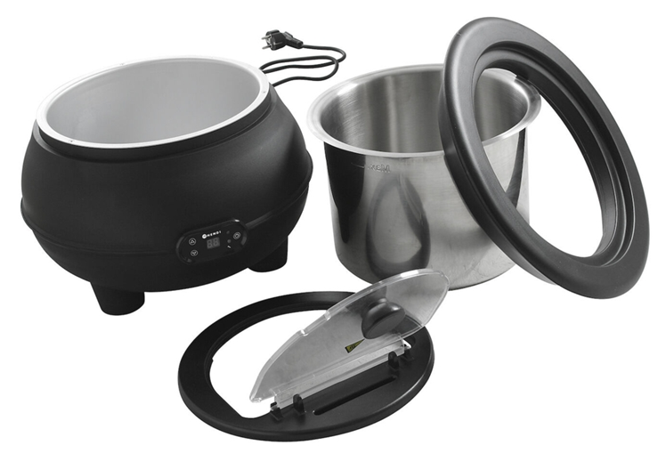 Цифрова панель інформує про температуру страви, інформує про низький рівень води та програмується. Захист від перегріву. Кришка має виріз для половника, а прогумовані ніжки стійкі до ковзання.