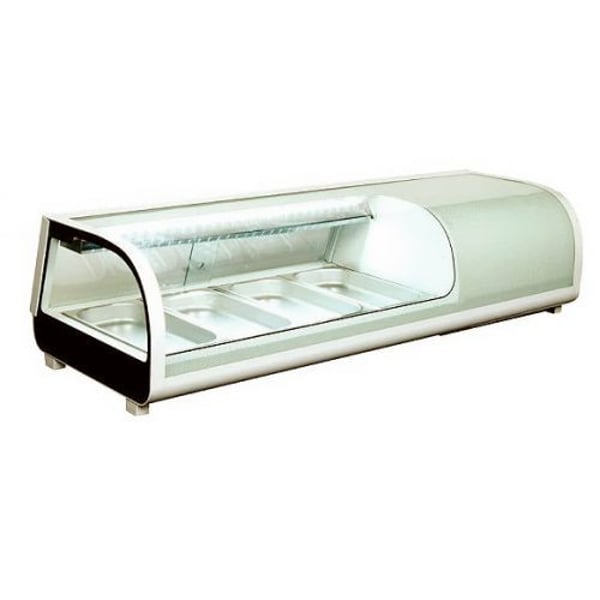 Вітрина для суші оснащена всередині 4-ма полицями GN 1/3, скло гнуте, всередині є світлодіодне підсвічування, розсувні шторки і каркас з нержавіючої сталі і пластику. Об'єм даного обладнання становить 43 літри.